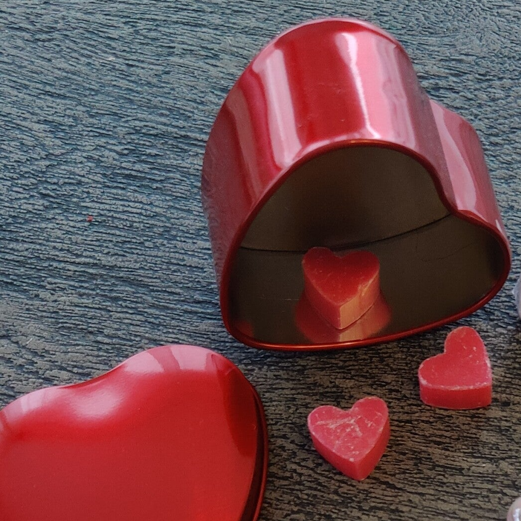 Eine herzförmige Dose in rot für gaaanz viel Maschenmarkierer & Handarbeitszubehör.