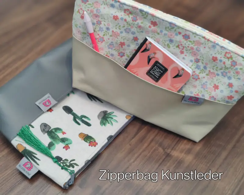 Zipperbag mit Kunstleder - Reißverschlusstasche mit Kunstlederboden und Außensteckfach, sowie innen eine kleine Stecktasche Größe 32 x 22 x 8 cm.